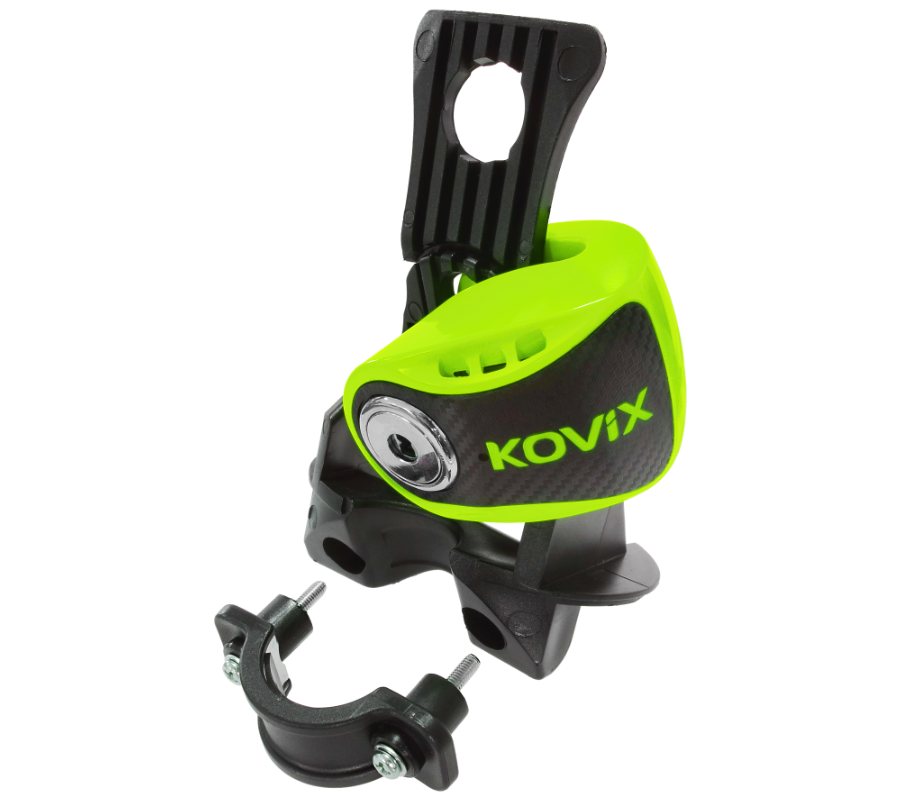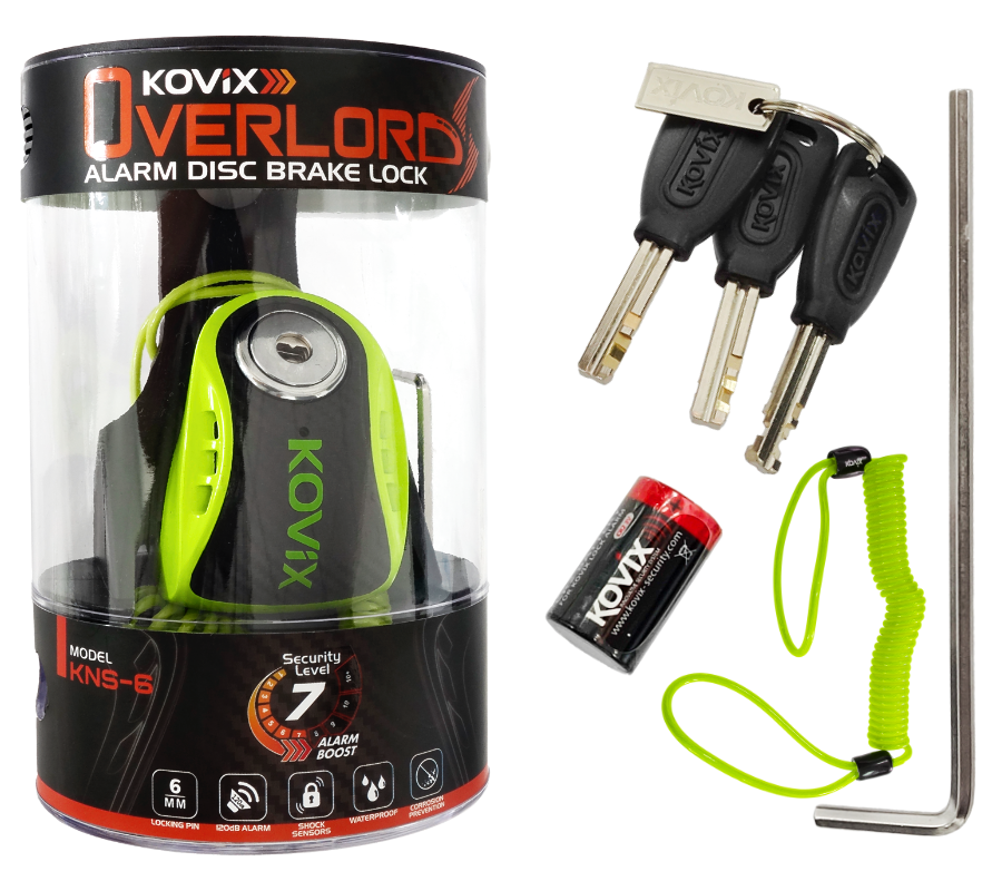 Blokada tarczy hamulcowej KNS6 z wbudowanych alarmem o natężeniu dźwięku 120 dB z możliwością ustawiania opcji syreny ON/OFF. Zamek ze stali nierdzewnej i wodoodporne podzespoły elektryczne gwarantują ochronę przed korozją i niezawodność w każdych warunkach atmosferycznych. Blokada wyposażona jest w długo pracującą i przyjazną dla środowiska litową baterię. Zabezpieczenie blokuje koło bolcem o średnicy 6 mm, przez co uniemożliwia jazdę i ruch motocykla lub skutera. Blokady tarczy hamulcowej marki KOVIX wykonane są z wysokiej jakości stali, dzięki czemu są odporne na korozję i uszkodzenia. Powleczone powłoką antykorozyjną, która chroni je przed zarysowaniami.
